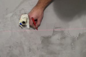 - Важнейшим этапом является разметка, которую лучше всего проводить с использованием лазерного уровня. Постарайтесь попробовать взять его в аренду на время работы. Если нет, то базовые горизонтальные линии можно отбить с помощью водяного уровня, вертикальные – отвесом. В ходе работ должен постоянно вестись контроль за ровностью рядов. В этом поможет строительный пузырьковый уровень (лучше иметь два, длинный и короткий, 400 мм) и длинное ровное правило. Для разметки, кроме того, понадобится линейка, рулетка, угольник, маркер или карандаш, желательно – способный оставлять свет на глазурованной поверхности керамики.