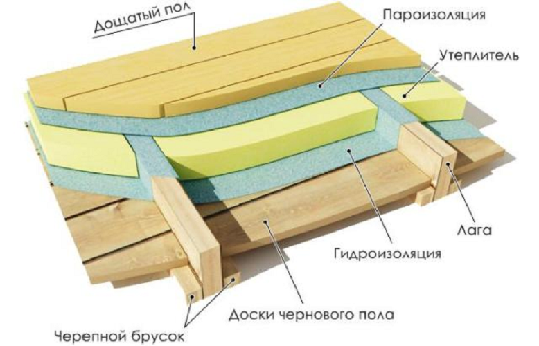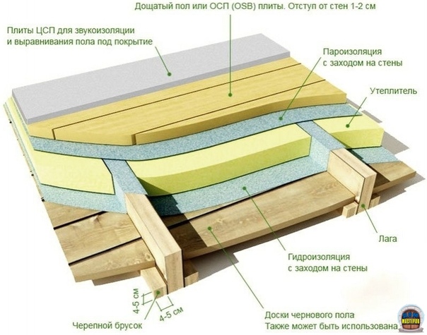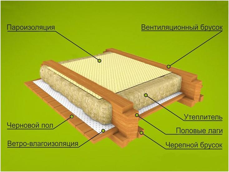 Схема работ проста: вы укладываете слоями теплоизоляционные материалы, далее — пароизоляцию и половое покрытие.
