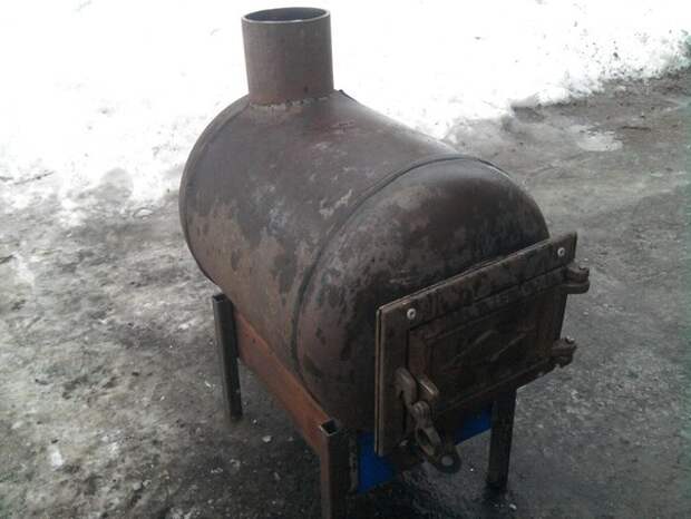 Разновидность буржуйки, которая предполагает горизонтальное расположение корпуса газового баллона. Достаточно простая в изготовлении конструкция