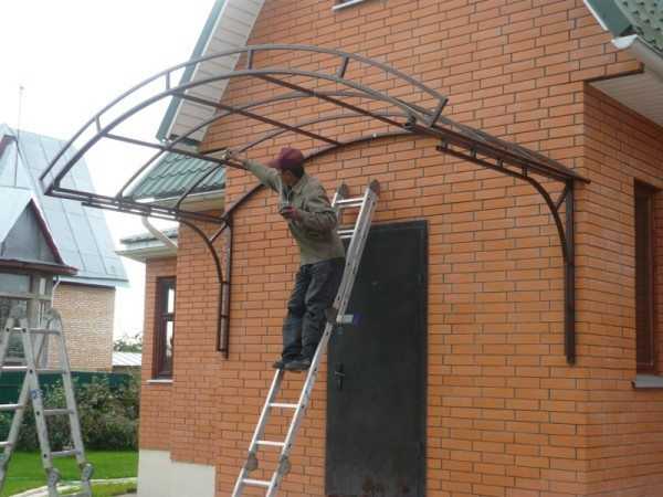 Обратите внимание! Перед тем, как сделать навес из поликарбоната своими руками, нужно определиться с конструкцией и материалом каркаса. Арочные и купольные козырьки изготавливают только на металлическом или кованном каркасе. Прямые, односкатные и двухскатные модели можно выполнить на любом основании.