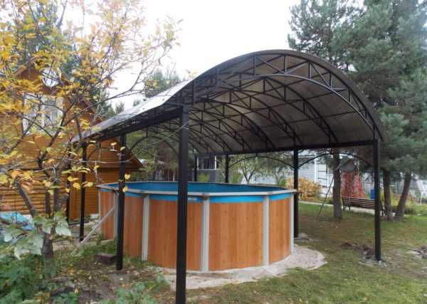 - Купольный. Так называют более сложную конструкцию навеса в виде купола. Дилетанту выполнить монтаж такого сооружения достаточно сложно, даже имея подробные чертежи и проект, эта работа требует мастерства и тщательной подгонки.