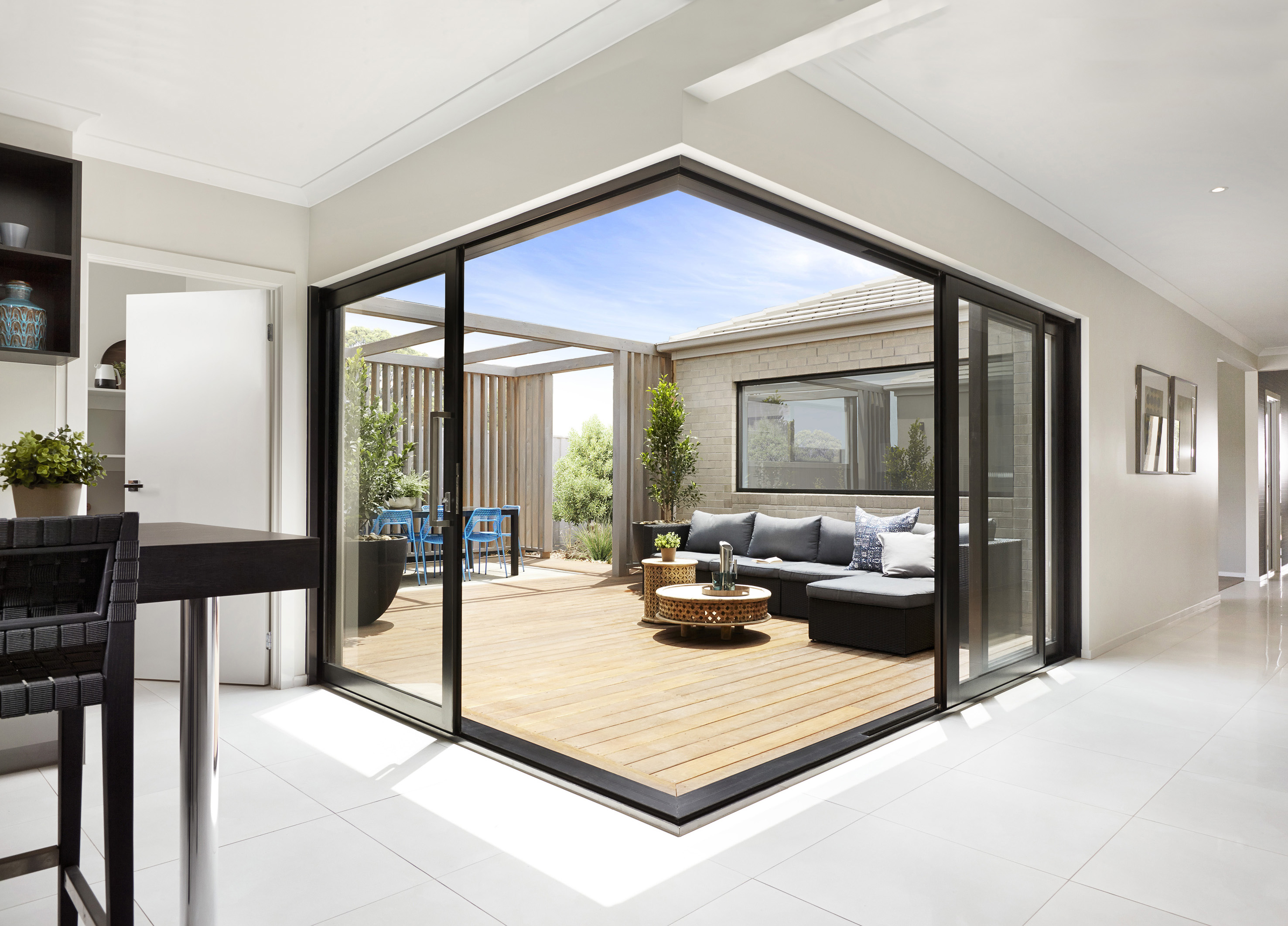 Воспользуйтесь видом на улицу, максимально органично интегрировав его в дизайн интерьера вашего дома с помощью бескаркасных систем раздвижных стеклянных стен. Используйте подход «меньше значит больше», чтобы создать идеальную картину.