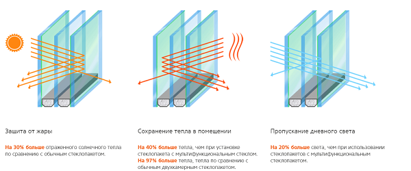 I-стекло – это нанесенное на обычное стекло специальное покрытие, которое не пропускает внутрь инфракрасное излучение. Эта функция не позволяет зимой выпускать тепло, а летом даёт сохранять прохладу.